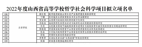 2022年10月18日,山西省教育厅发布了《关于公布2022年度山西省高等学校科技创新计划各类项目的通知》(晋教科[2022]2号)。其中,我校共获批山西省高等学校哲学社会科学研究项目10项,其中,体育系获批4项,立项数量再创新高。