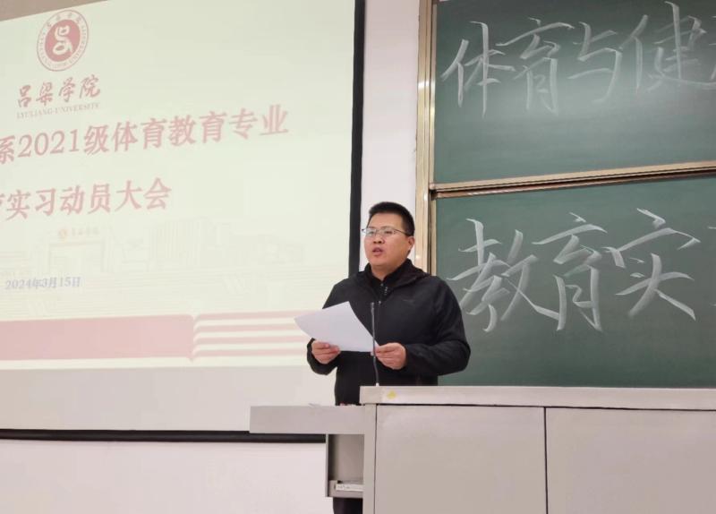 教育实习是师范生培养的重要途径,为确保2021级全体学生实习工作的顺利开展,3月15日下午,我系于综B阶教201召开了教育实习动员大会。大会由太阳集团9728副主任李艳江主持,系主任赵永军以及吕梁市第三中学体卫艺中心主任郭晓刚出席了本次大会并开展了动员讲话。