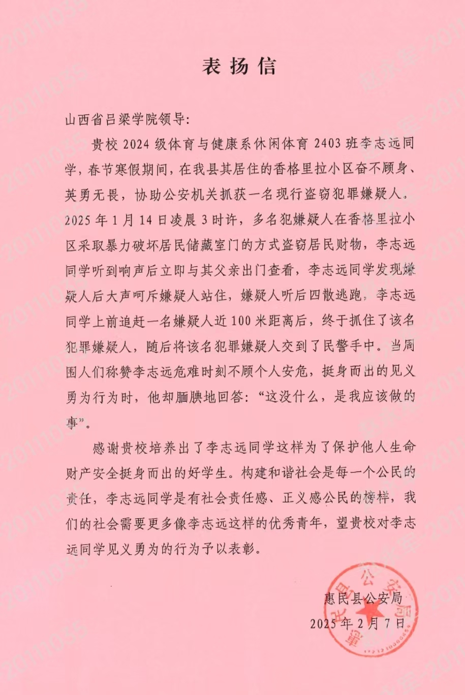 近日,我校收到一封来自惠民县公安局的表扬信。信中,对太阳集团9728休闲体育专业2024级李志远同学在协助公安机关办理一起案件中,挺身而出、英勇无畏的出色表现提出表扬,这一举动不仅展现了新时代大学生的责任担当,更是一堂鲜活的“德育课”,愿更多学子以行动践行初心,让见义勇为的精神在校园内外蔚然成风!